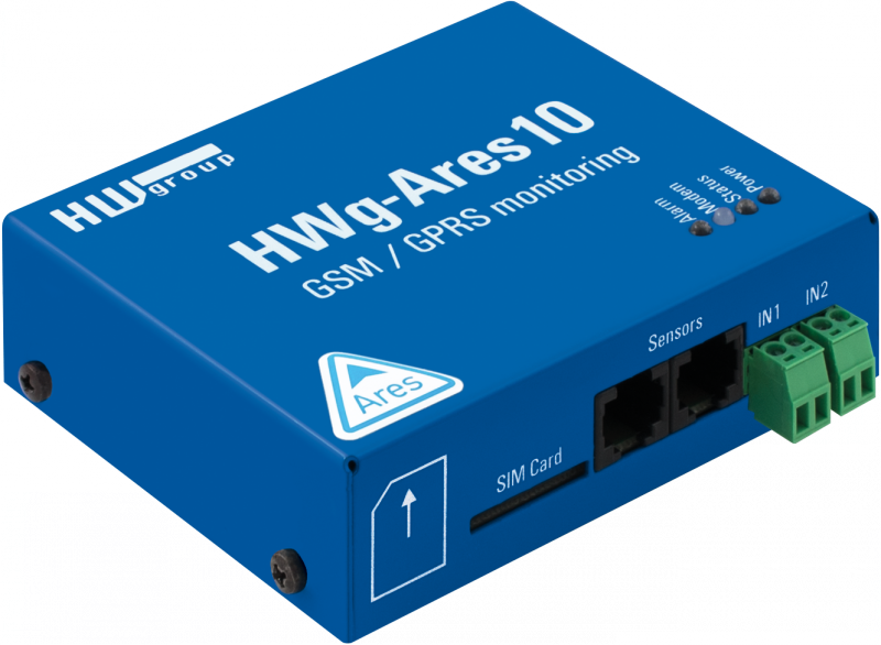 HWg-Ares10 je cenově efektivní GSM teploměr pro vzdálený dohled a odesílání poplachů z míst bez možnosti připojení k LAN, k němuž lze připojit až 6x senzor na 1 Wire a 1Wire-UNI a 2x detektor na DI. Přes on-line aplikaci HWPortal.cz lze HWg-Ares10 konfigurovat a ovládat, rozesílat alarmy či prohlížet grafy hodnot. HWg-Ares10 hlídá rozsahy hodnot připojených senzorů, při alarmové hodnotě posílá e-mail, SMS nebo prozvoní zadaná telefonní čísla. Produkty řady Ares umožňují vzdálenou aktualizaci firmware „FOTA“ (Firmware Over The Air).