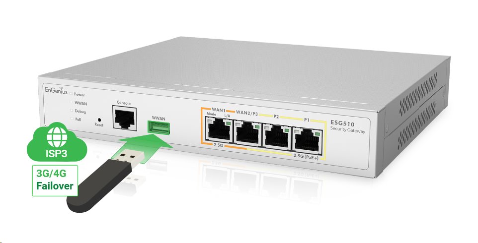 SD-WAN Gateway EnGenius ESG510 dokonale sjednotí technologii v síti postavené na prvcích EnGenius a poskytne tak neuvěřitelně snadné nastavení, zabezpečení na podnikové úrovni a komplexní síťové řešení, které lze cloudově spravovat naprosto odkudkoli. EnGenius ESG510 může fungovat ve dvou režimech - transparentní bridge s možností firewallu a nebo v režimu výkoného routeru. Zde krom klasických funkcí jako je firewall, DHCP server nebo Site-to-site VPN/Client VPN nabízí i 2 nezávislé WAN porty s možností load balancingu a USB vstup pro připojení LTE/5G modemu´jako třetí záložní linky. To vše pomocí konfigurovatelných 1/2.5G Ethernetových portů v kompaktním chassis vybaveném TPM chipsetem pro maximální zabezpečení a centrální cloudovou správou přes EnGenius Cloud.