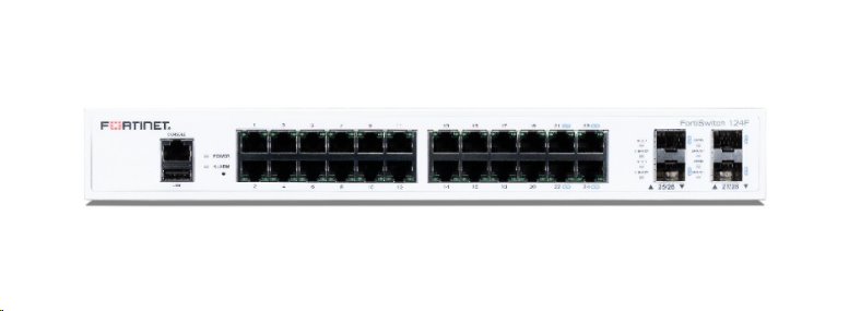 FortiSwitch FS-124F je plně řízený gigabitový Layer 2 switch s 24x GE RJ45 porty a k tomu 4x SFP+ porty pro uplinkové propojení. Zařízení má přepínací kapacitu 128 Gbps a propustnost 190 Mpps, což zaručuje plynulý provoz i při plném zatížení.