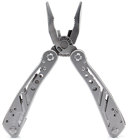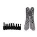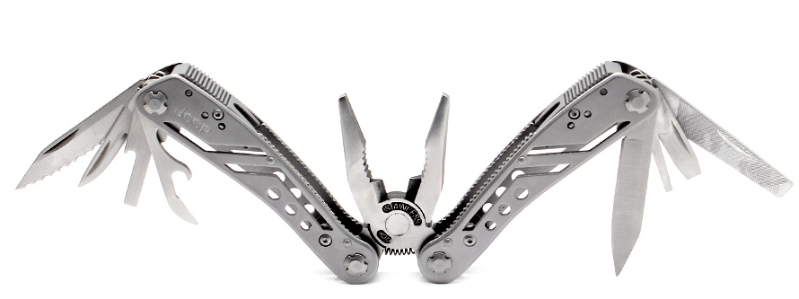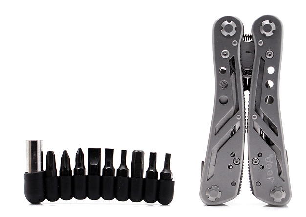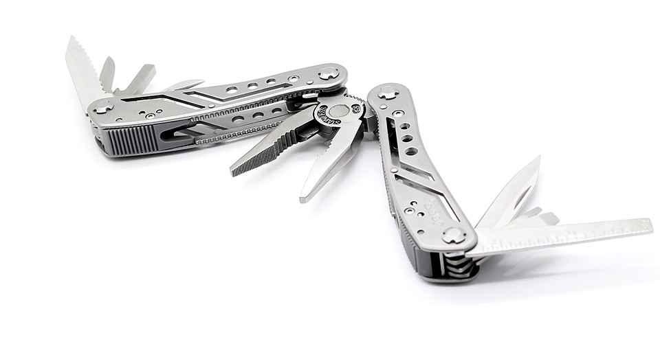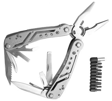 Folding pliers with saw, width, screwdriver (a set of bits included), bottle/canned opener, nail file.