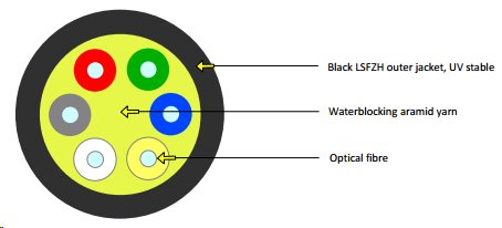 Univerzální optický kabel pro vnitřní i venkovní použití, s možností závesu, LSOH plášť, 12 vláken, singlemode, (SM), 9/125, 7A01, DROP, 3mm, KDP, vlákno OFS Allwave, barva černáDalší informace