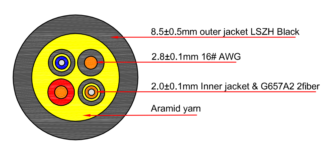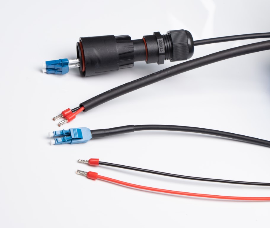 Součástí kabelu jsou mimo optických vláken také dva měděné napájecí vodiče o průřezu 1,5 mm2 na obou koncích zakončené dutinkami. Rozplet na straně napájecího zdroje/switche má délku 1,5 m, rozplet na straně venkovního zařízení je 30cm.