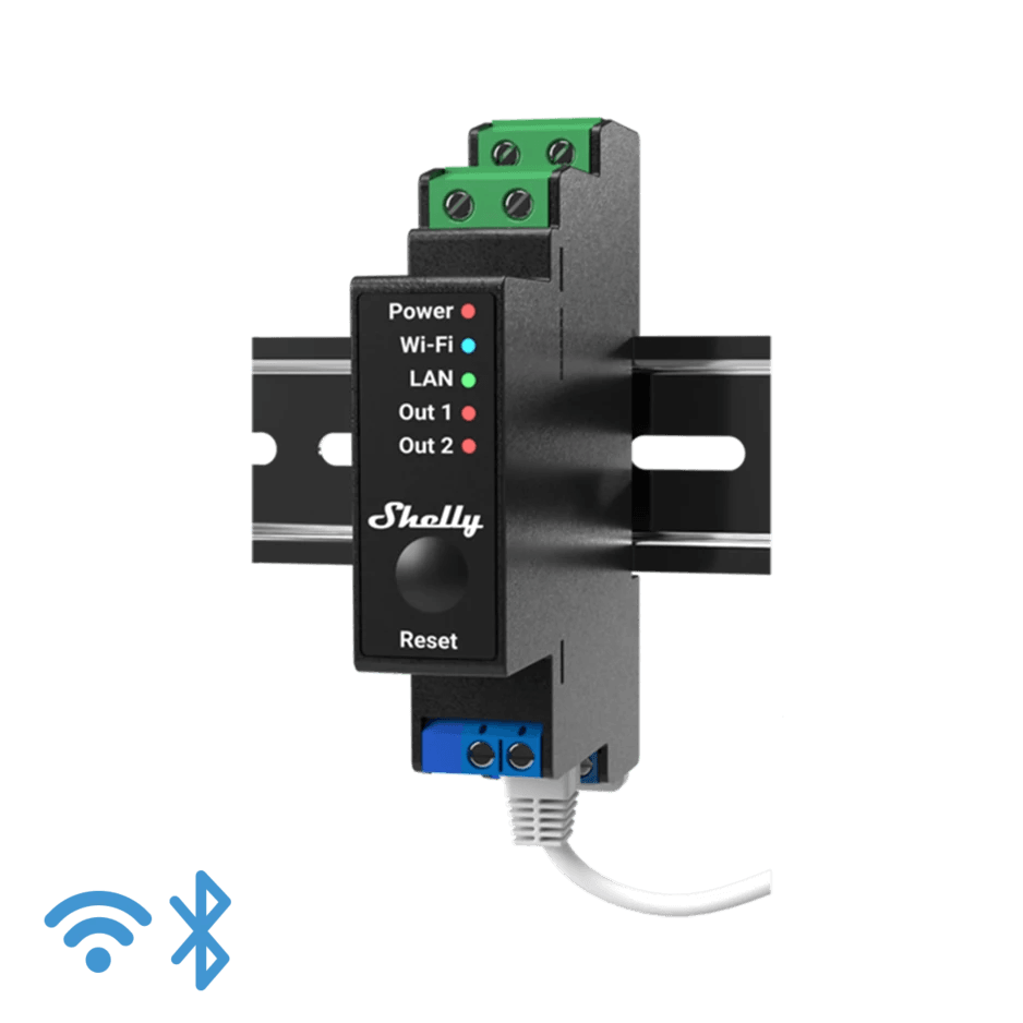 Shelly Pro 2PM je 2kanálové relé podporující až 25 A (každý 16 A) s měřením spotřeby pro profesionální automatizaci světel a spotřebičů v obytných nebo komerčních aplikacích. Konektivita je řešena pomocí Wi-Fi (2.4GHz), LAN (RJ45) a Bluetooth..Další informace