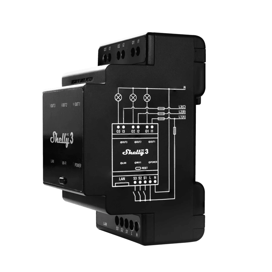Shelly Pro 3 je 3kanálové relé podporující až 48 A (každý 16 A) pro profesionální automatizaci světel a spotřebičů v obytných nebo komerčních aplikacích. Je vybaven bezpotenciálovými výstupy (suché kontakty). Konektivita je řešena pomocí Wi-Fi (2.4GHz), LAN (RJ45) a Bluetooth. Shelly Pro 3 má skriptovací funkce (plná podpora mjS) pro vlastní automatizační scénáře založené na externích datech nebo různých událostech.