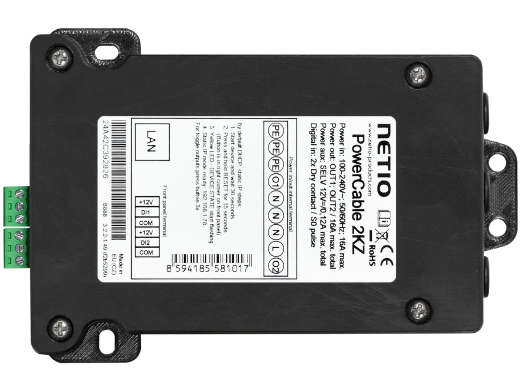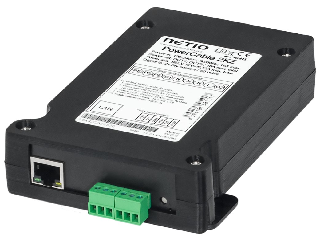 Netio PowerBox 2Kz is on LAN and WiFi controlled smart PDUs 2 outputs . Each output can be turned on and off via the product interface. Electric quantities (A, W, KWH, TPF) with high accuracy are measured at each output. The materials and temperature ranges of the equipment predetermine for use in industries. Both outputs are extended with DI (digital inputs) that can be used to connect movement sensors or S0 meters outputs. With compact dimensions, PDUs can be easily installed, for example, for screens, ceilings or other less accessible places.