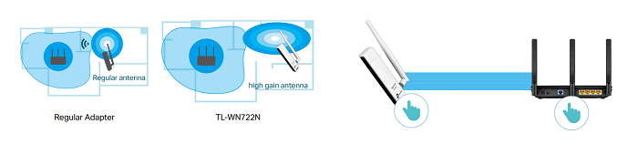 K adaptéru je přiložena 4 dBi anténa, kterou je možné v případě potřeby nahradit výkonnější. Připojení adaptéru k počítači je realizováno pomocí USB portu, kterým disponuje každý osobní počítač.
