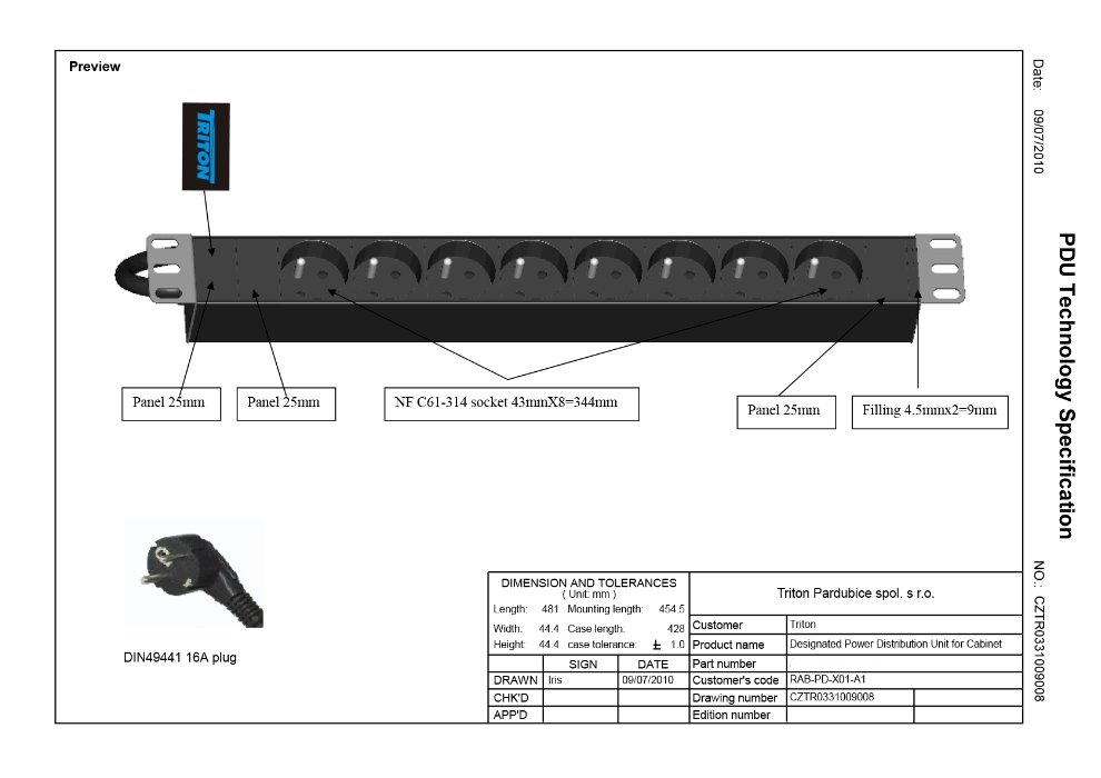 Triton 19"1U, 8 x socket according to CSN, max 16 A; 3 x 1.5 mm cable, 2 m + CZ-DE universal plug max. 1