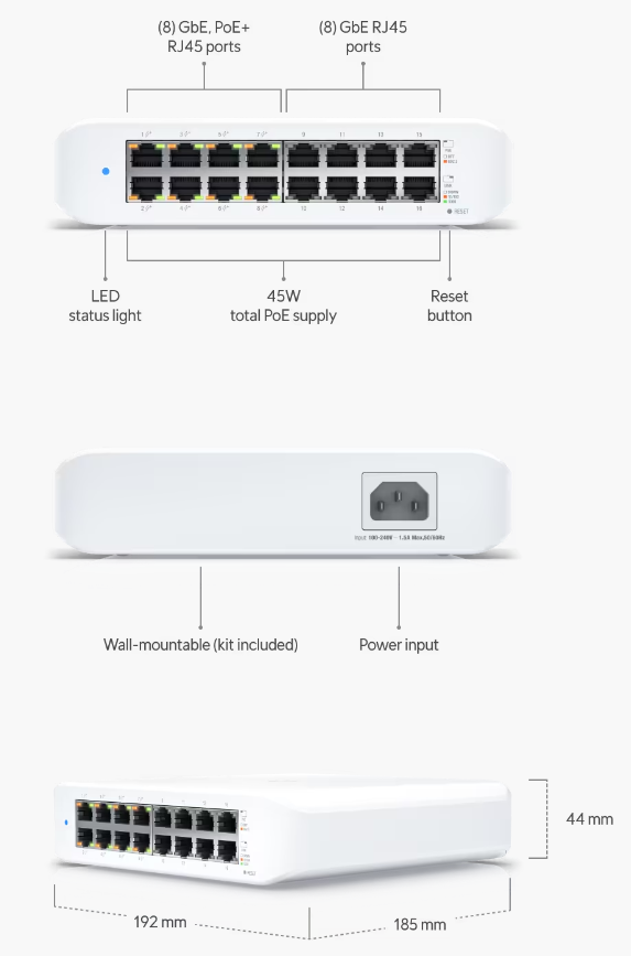 Ubiquiti UniFi Switch Lite 16 PoE je Gigabitový PoE L2 switch v desktop provedení s maximálním PoE budgetem 45 W. Managovatelný switch s 16 Gigabit metalickými porty a celkovou propustnost 16 Gbps.Další informace