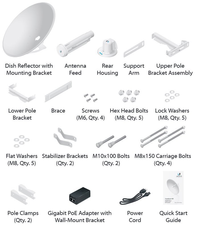 Uvnitř PowerBeamu se nachází výkonný MIPS procesor Atheros 74KC s frekvencí 720 MHz, kterému sekunduje 128 MB operační paměti typu DDR2 a 16 MB Flash paměť. Síťový port podporuje 10/100/1000 Ethernet a lze po něm jednotku napájet pasivním Gigabit PoE 24 V/0,5 A adaptérem, který je součástí balení (aktivní PoE dle 802.3af není podporováno).