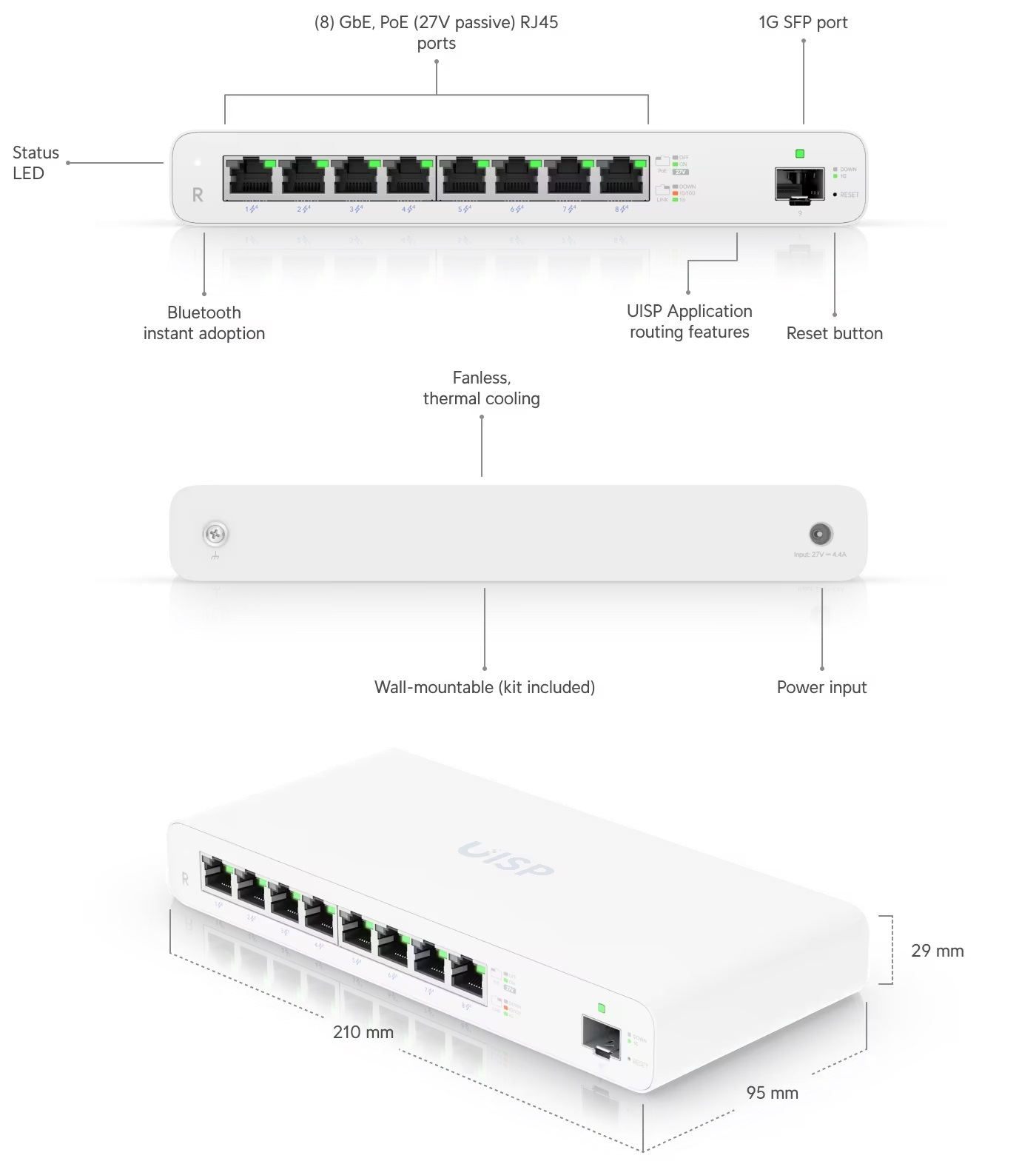 UBNT UISP Router je router bez ventilátorů s 8x Gigabit LAN a 1x SFP portem. Celkový PoE budget je 110 W a maximálně 30 W / port.Další informace
