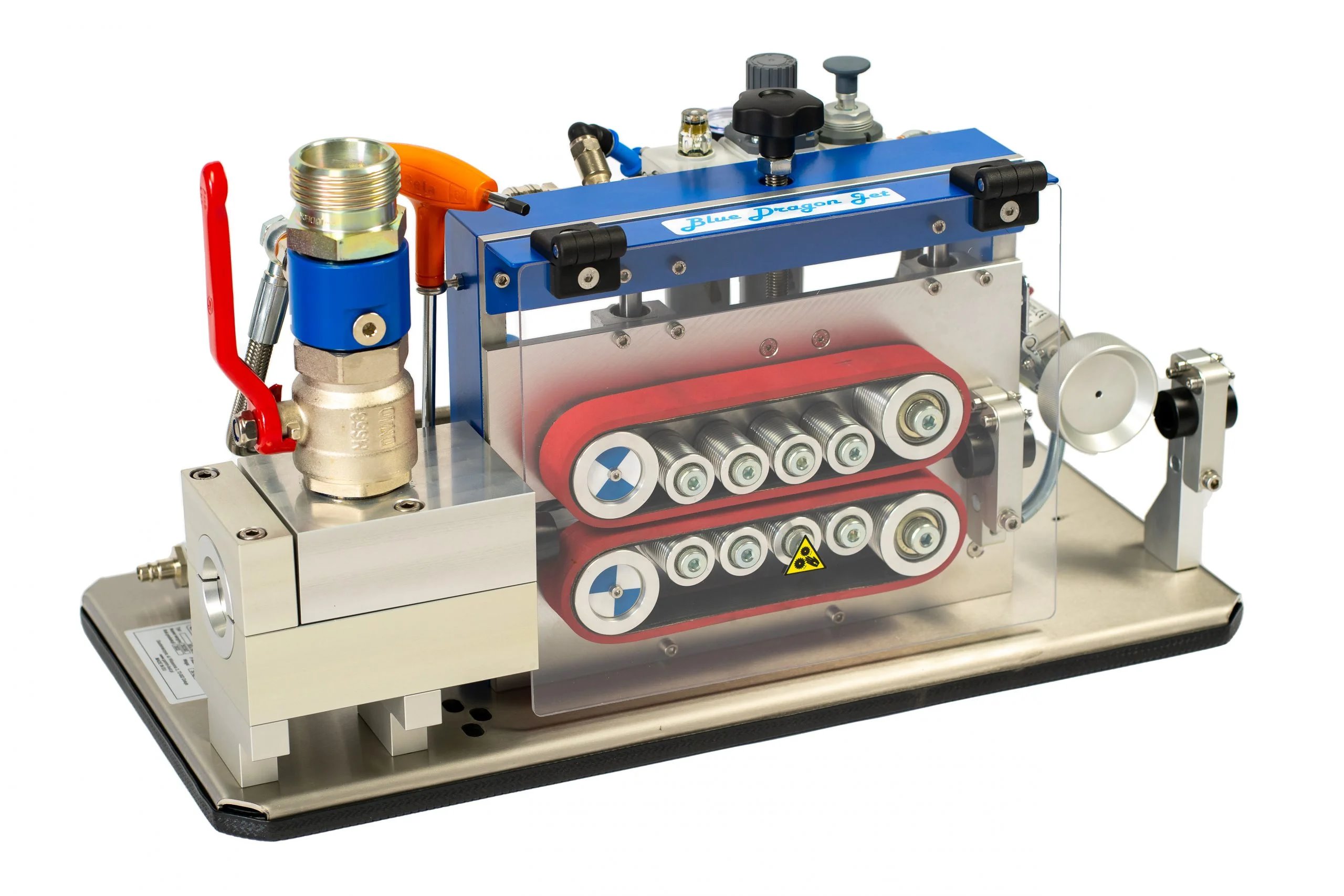 Zafukovačka Blue Dragon Jet MAX je profesionální pásové zařízení s pneumatickým pohonem určené k zafukování kabelů a mikrotrubiček do HDPE trubek. Díky své jednoduché a robustní konstrukci je velmi snadno ovladatelná při zachování dlouhé životnosti. Stroj je s dodávaným příslušenstvím zafukovat kabely/trubičky o průměrech 6 - 15 mm do HDPE trubek 32, 40 a 50 mm. Konstrukce je uzpůsobena pro možnost vyjmutí neukončeného kabelu. Zafukovačka je vybavena praktickým mechanickým počítadlem, které umožní odečítat délku zafukovaného kabelu.