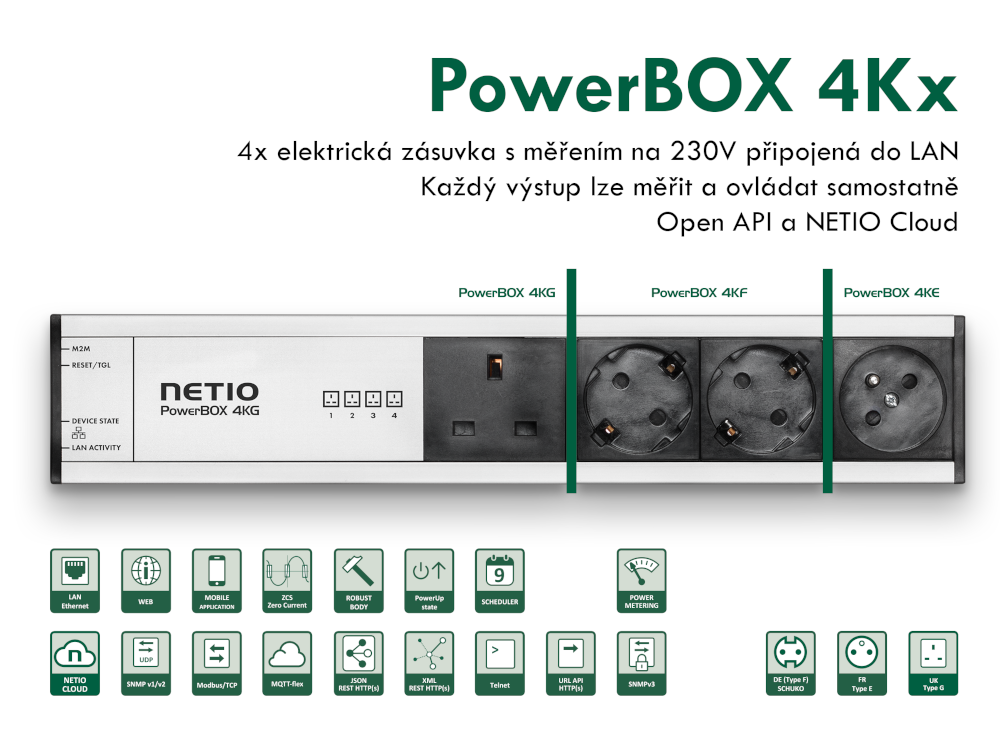 NETIO PowerBOX 4KE je po LAN ovládaná elektrická zásuvka se 4 výstupy. Přes web rozhraní produktu lze vypnout a zapnout každý výstup samostatně. Na každém výstupu jsou měřeny elektrické veličiny (A, W, kWh, TPF) s vysokou přesností. Použité materiály a teplotní rozsahy zařízení předurčují pro využití v průmyslových odvětvích.
