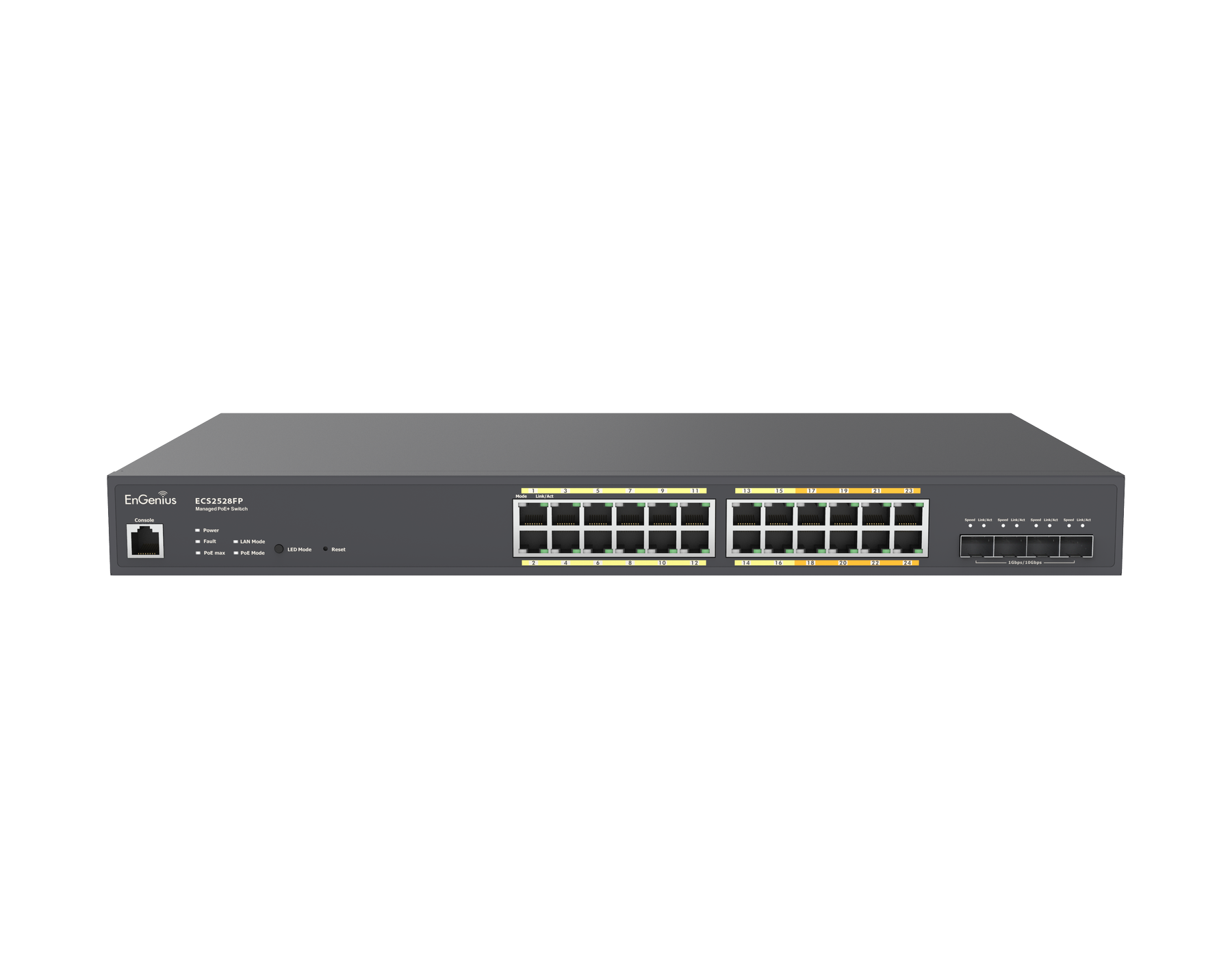 EnGenius ECS2528FP je 24-portový (16x 1G + 8x Multi-G RJ45) PoE Switch s centrální cloudovou správou. Je vybaven možností lokální nebo centrální konfigurace, monitorováním a správou sítě a snadno použitelným webovým rozhraním. Napájí kompatibilní PoE zařízení dle normy 802.3af/at, jako jsou IP kamery, VoIP telefony a AP. Celkový power budget je 410 W.