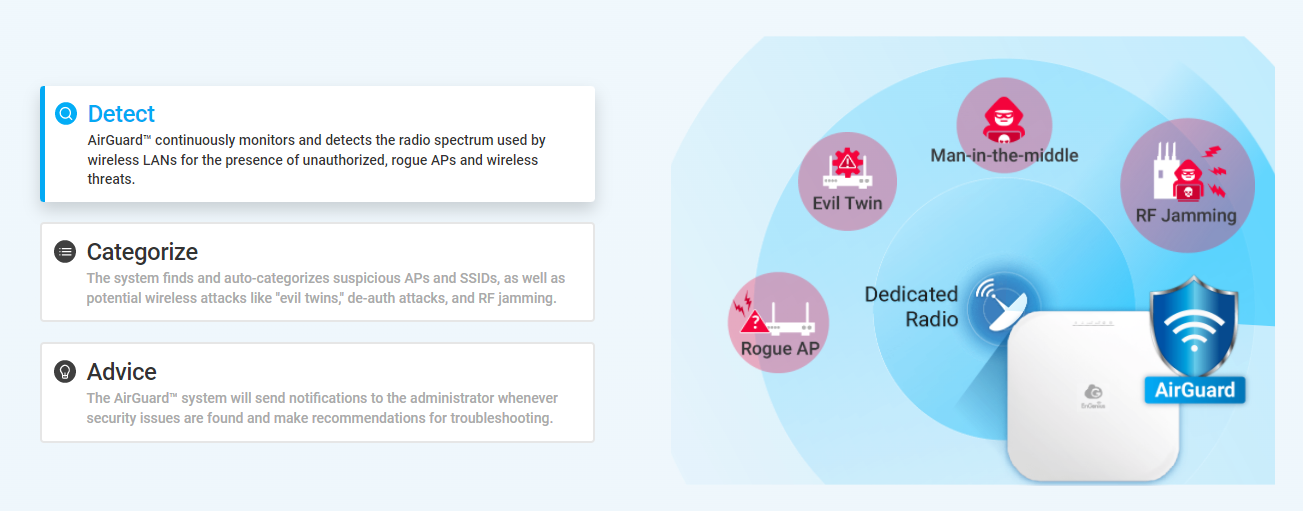 Dvoupásmový přístupový bod EnGenius ECW220S je zvláště vhodný pro použití v podnikových prostředích., kde je kladen důraz na bezpečí sítě. Poskytuje rychlé a spolehlivé Wi-Fi pokrytí v pásmech 2,4 GHz a 5 GHz s podporou nejnovější WiFi 6, přenosovou rychlost až 1 774 Mbps, 2×2:2 MU-MIMO, TX Beamforming, patentovaná technologie Mesh. Navíc obsahuje dedikované security rádio s patentovanou technologií AirGuard, díky kterému v reálném čase detekuje a eliminuje hrozby pro vaši síť. Díky podpoře BLE 5.0 (Bluetooth Low Energy) je navíc možné získat ještě více informací o zařízení v dosahu a využít například pro přesnou geolokaci.