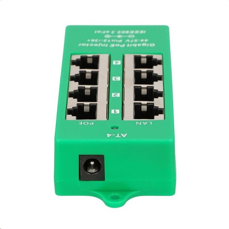 Panel integrující čtyři gigabitové PoE injektory s napájecím rozsahem 44-57 V a max. proudem 550 mA/port s podporou standardu 802.3af/at.