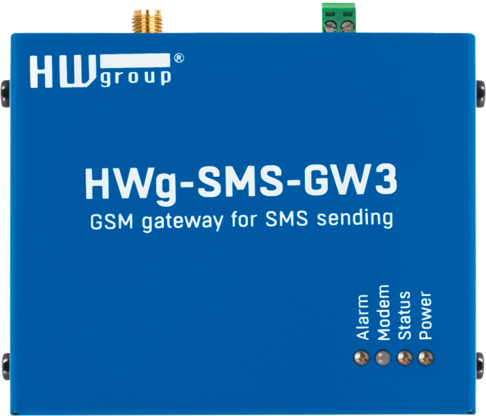 HWg-SMS-GW3 je brána pro odesílání a přijímání poplachových SMS po síti GSM. Další důležitou funkcí je i prozvánění nastavených telefonních čísel při alarmové situaci. Snadná instalace k monitoringu od HW group, ale i možnost používat samostatně, jako rychlý komunikační nástroj (obecní hlášení, školní hlášení, firemní oznamování...). Nepotřebuje žádný software, funguje po LAN na úrovni Box-2-Box. Rychlost odesílání je 30 SMS za minutu.