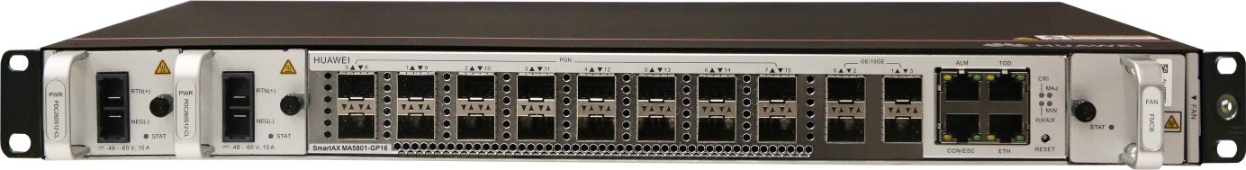 00072170 | Huawei MA5801-GP16 je špičkový OLT terminál určený pro GPON síť, který nabízí 16x GPON port pro připojení klientských zařízení (ONT) a 4x 10G SFP+ uplink port. Celkem je k MA5801-GP16 možné připojit až 1024 klientských jednotek. | |||||