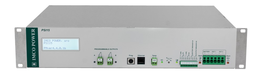 Modelová řada PSI15 je určená pro montáž do 19“ racku / 2U pozice. Připojení na síť je přes pohyblivý přívod, výstup invertoru je přes standardní zásuvku na zadní straně. Připojení akumulátoru a výstupů je přes svorky na přední straně.