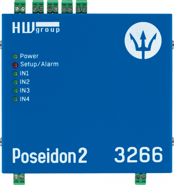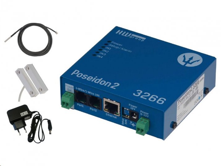 Poseidon2 3266 Teplotní set obsahuje vše potřebné pro instalaci a zahájení dohledu a měření. Poseidon2 3266 měří teplotu, vlhkost , stavy kontaktů (DI vstupy) a jiných externích senzorů, odešle email při hodnotě mimo rozsah. Poseidon2 3266 lze připojit do systému pro monitoring prostředí. Podporuje M2M protokoly SNMP v3, Modbus/TCP, XML a online aplikace HWPortal.cz.