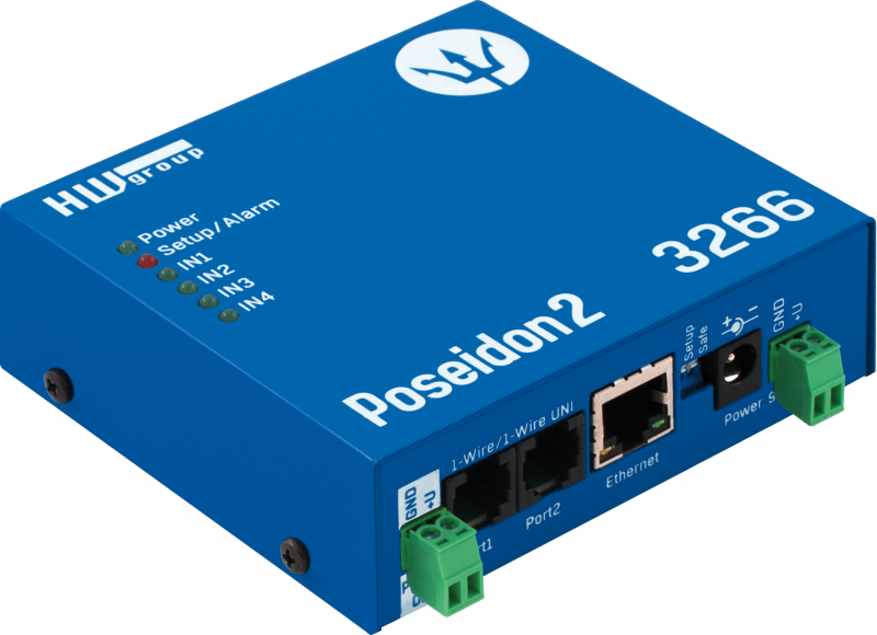 Poseidon2 3266 je základní jednotka pro vzdálené měření (dohled) senzorů po síti. Po sběrnici 1Wire a 1Wire-UNI měří teplotu, vlhkost, napětí, záplavu... Je vybaven 4x DI vstupem pro senzory s binárním výstupem. Odešle email při hodnotě mimo rozsah, nebo jej lze připojit do systému pro monitoring prostředí (SNMP Trap).