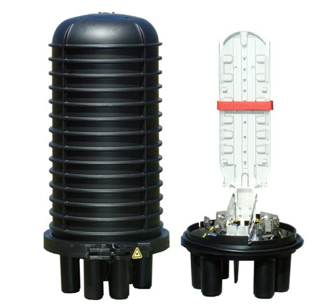 Vodotěsná spojka/rozvaděč, hrncového typu. Pro podzemní a nadzemní instalaci, součástí kompletní instalační příslušenství (i pro montáž na sloup). Včetně optických kazet pro maximální možnou kapacitu pouzdra 144 vláken, 6 kazet po 24 svárech, černá kaz...