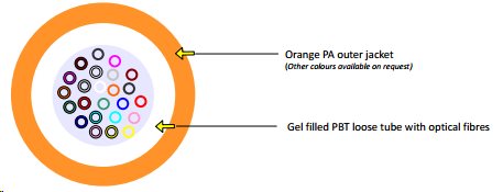 Optický kabel vhodný pro venkovní použití s centrální trubkou, PA pláštěm, 24 vláken, singelmode, (SM), 9/125, Z238, 2,8mm, KDP, vlákno OFS AllwaveDalší informace