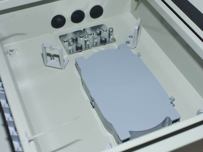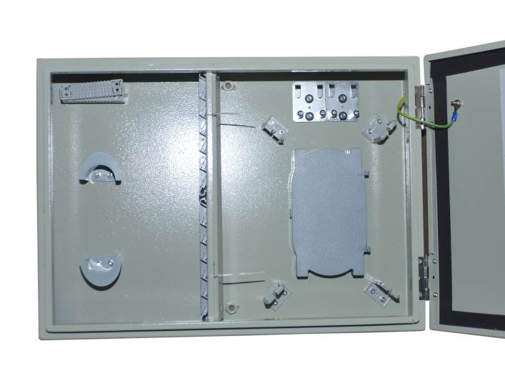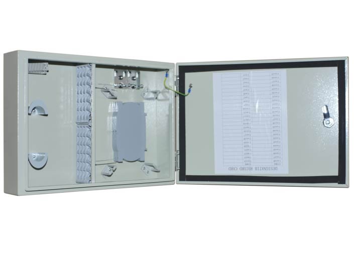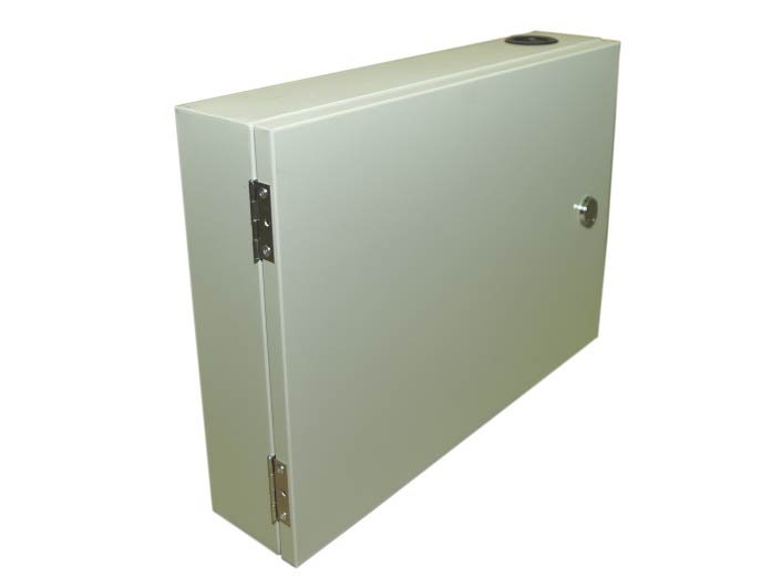 Optický plechový rozvaděč, 1x zámek. Konstrukce: pro max. 48 ks SC simplex spojek. Barva: šedá; Krytí IP65 (vnější prostředí); Obsahuje: 2x optická kazeta pro 24 svárů,; kotvící šrouby; smršťovací trubičky; 8x vstup pro optický kabel. 48x ochrana svárů...Další informace