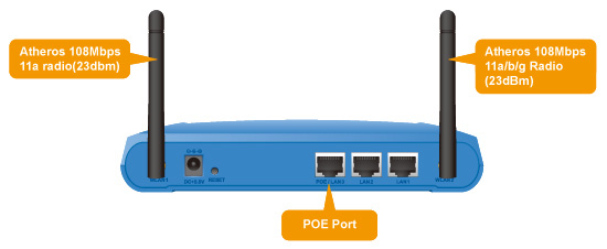 - 2 x Atheros radio ( 1x 108Mbps 802.11a + 1x 108Mbps 802.11a/b/g)