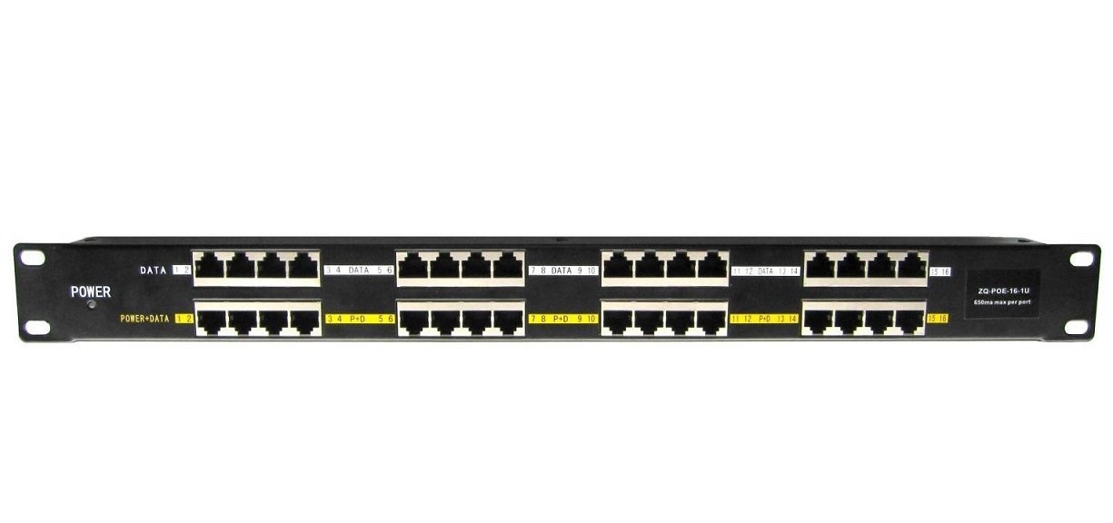 PoE panel 19", osazený, stíněný, 16 x RJ45, pasivní PoE injektor