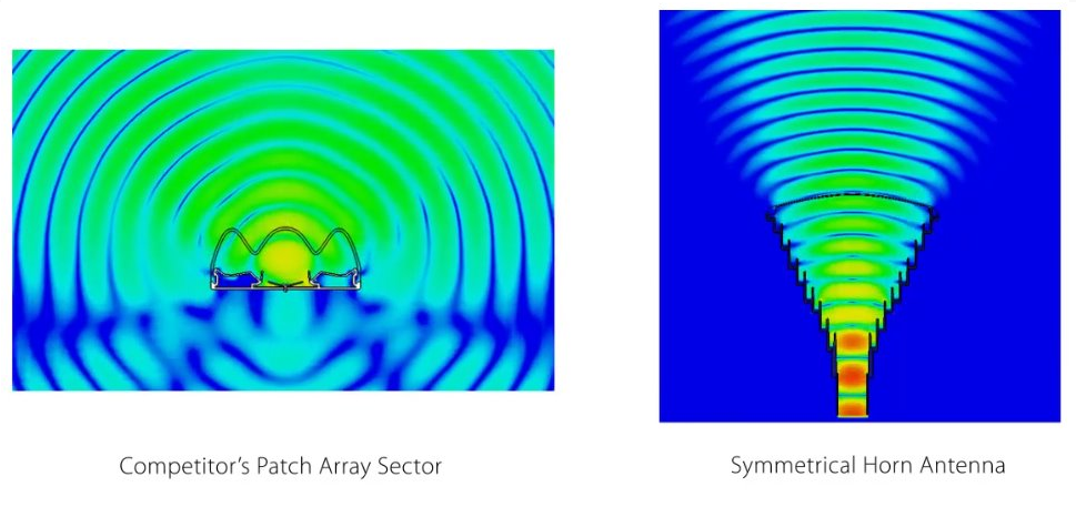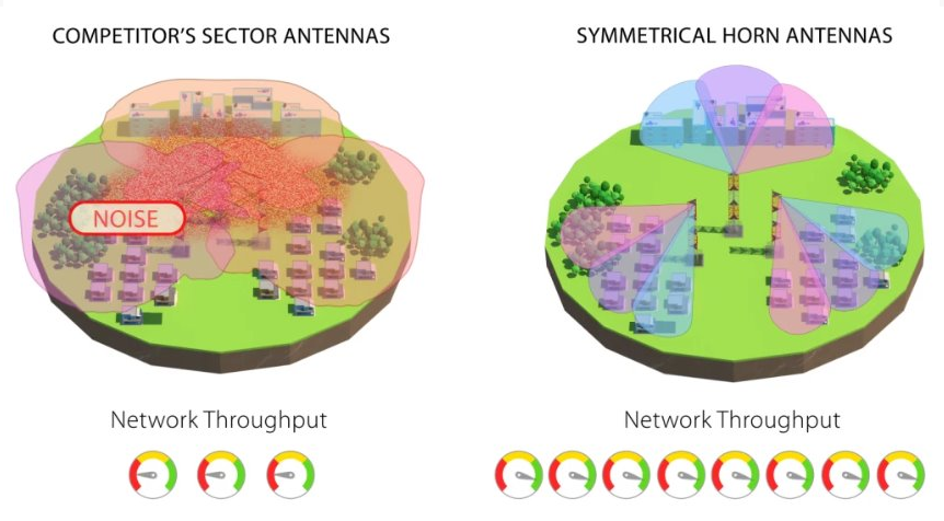 Symetrické antény nevyzařují boční laloky, doslova zaměřují energii na jeden hlavní signální paprsek. Takové chování je jedno z nejdůležitějších v bezdrátových sítích. Díky těmto jedinečným vyzařovacím vlastnostem sbírá rádio ve srovnání se stávajícími anténami běžného sektoru značně méně hluku. Problém hluku je přímo spojen s bočními laloky antény - v zásadě nevyhnutelným prvkem ve většině konkurenčních produktů. Symetrické antény se chovají jinak, jsou v podstatě "hluché" mimo hlavní paprsek.