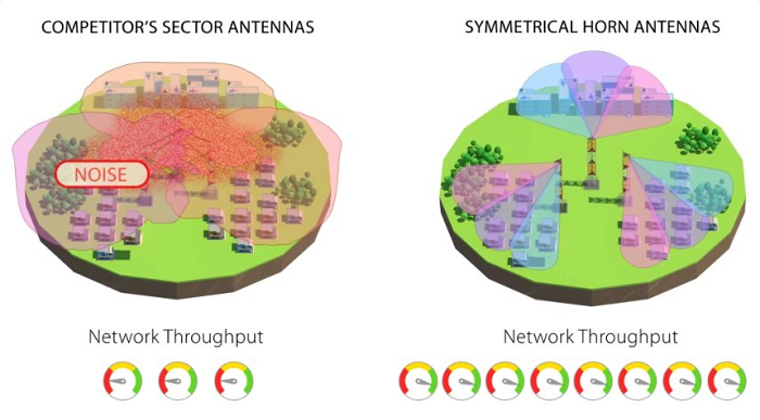 Symetrické antény nevyzařují boční laloky, doslova zaměřují energii na jeden hlavní signální paprsek. Takové chování je jedno z nejdůležitějších v bezdrátových sítích. Díky těmto jedinečným vyzařovacím vlastnostem sbírá rádio ve srovnání se stávajícími anténami běžného sektoru značně méně hluku. Problém hluku je přímo spojen s bočními laloky antény - v zásadě nevyhnutelným prvkem ve většině konkurenčních produktů. Symetrické antény se chovají jinak, jsou v podstatě "hluché" mimo hlavní paprsek.