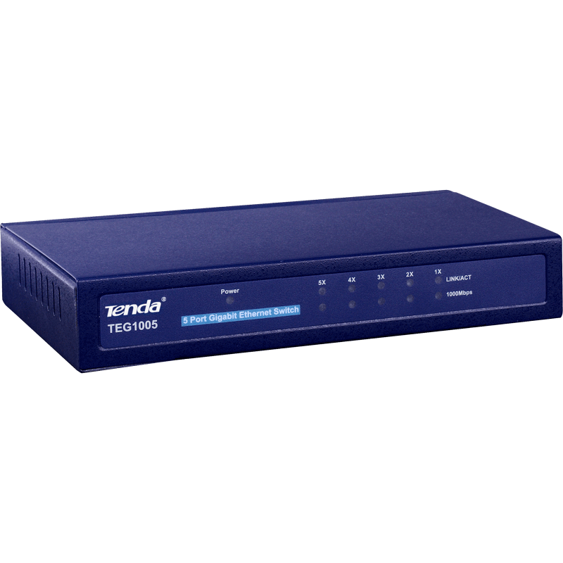 Switch Tenda TEG1005, desktopový Gigabit Ethernet Switch, nabízí 5x10/100/1000Mbps Auto-negotiation Ethernet porty. Všechny porty podporují Auto MDI / MDIX. Díky tomuto switchi můžete výrazně zvýšit přenosové rychlosti ve vaší síti a díky kovovému provedení je zaručena dlouhá životnost.