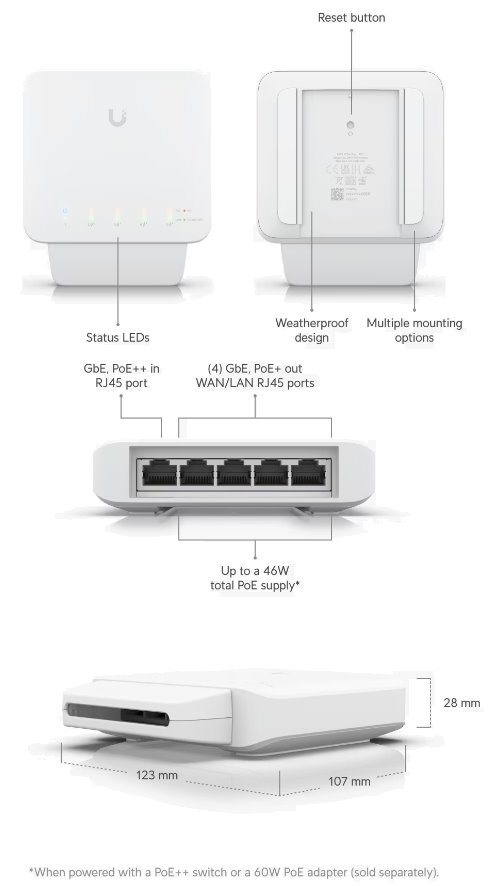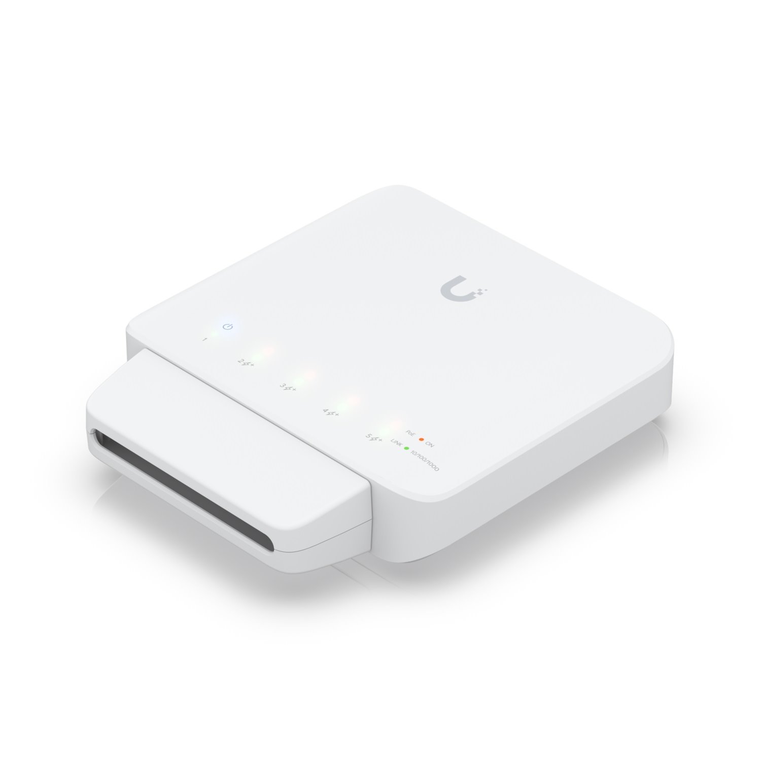 Ubiquiti UniFi Switch USW-Flex je 5-portový venkovní Gigabitový PoE switch s možností PoE-In a PoE-Out na 4 portech. PoE budget je 46 W (15,4 W /port).Další informace