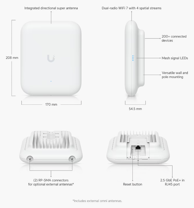 Ubiquiti UniFi U7 Outdoor je WiFi 7 přístupový bod s integrovanými anténami se ziskem až 12,5 dBi. Poskytuje přenosové rychlosti 4324 Mbps (5 GHz) + 688 Mbps (2,4 GHz).Další informace