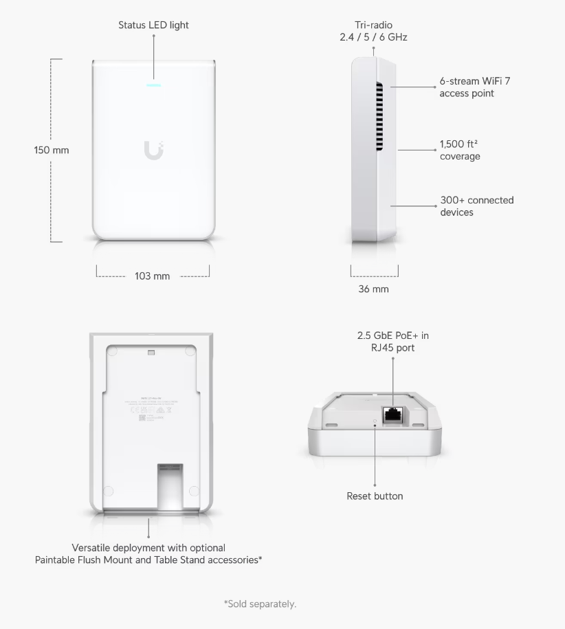 Ubiquiti UniFi U7 Pro Wall je WiFi 7 přístupový bod s integrovanými anténami se ziskem až 6 dBi. Poskytuje přenosové rychlosti 5764 Mbps (6 GHz) + 4324 Mbps (5 GHz) + 688 Mbps (2,4 GHz).Další informace