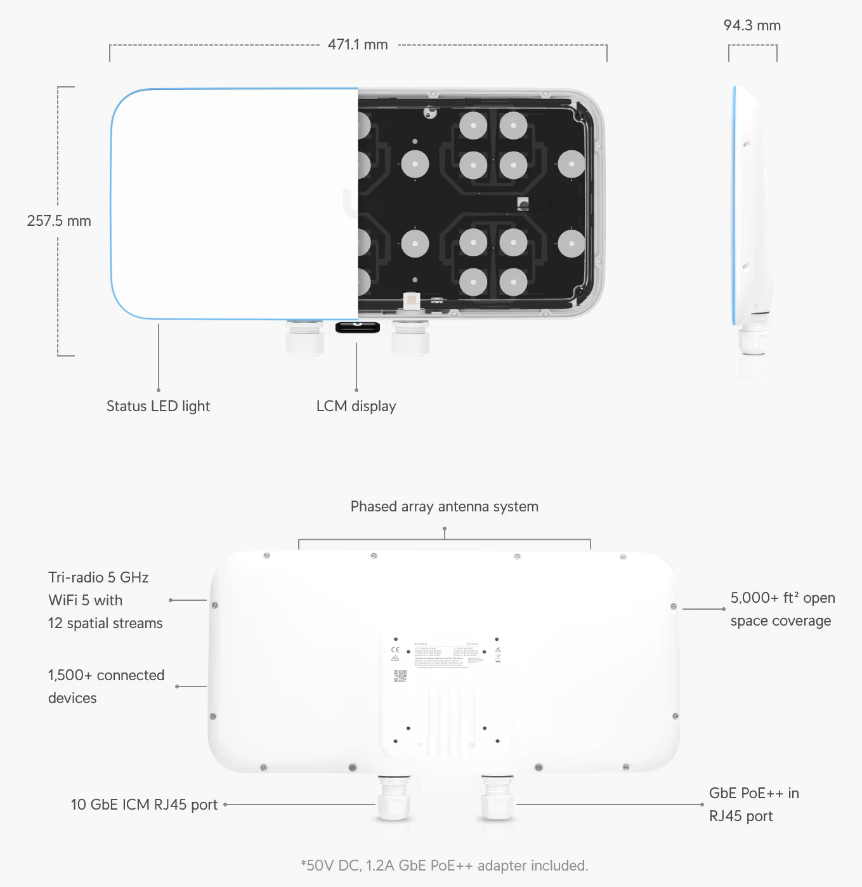 Jednotka disponuje pouze 5GHz radiovou částí, která poskytuje vyšší výkon a propustnost než pásmo 2.4 GHz. Dual-Mode nastavitelná anténa má zisk 10 dBi při vyzařovacím úhlu 90° a 15 dBi při vyzařovacím úhlu 50°. Díky 3 radiovým částem dokáže jednotka obsloužit až 1500 připojených zařízení, doporučené maximum je 750 klientských zařízení. Maximální modulační rychlost díky technologii 4x4 MU-MIMO činí 1733 Mbps pro každou radiovou část a nechybí ani podpora technologie Beamforming. Přenos dat po ethernetu zajistí dvojice portů (1x10/100/1000 Mbps, 1x1/10 Gbps IMC). Napájení jednotky je možné aktivním POE 802.3bt nebo přiloženým POE adaptérem 50 V / 1.2 A s gigabitovým portem.