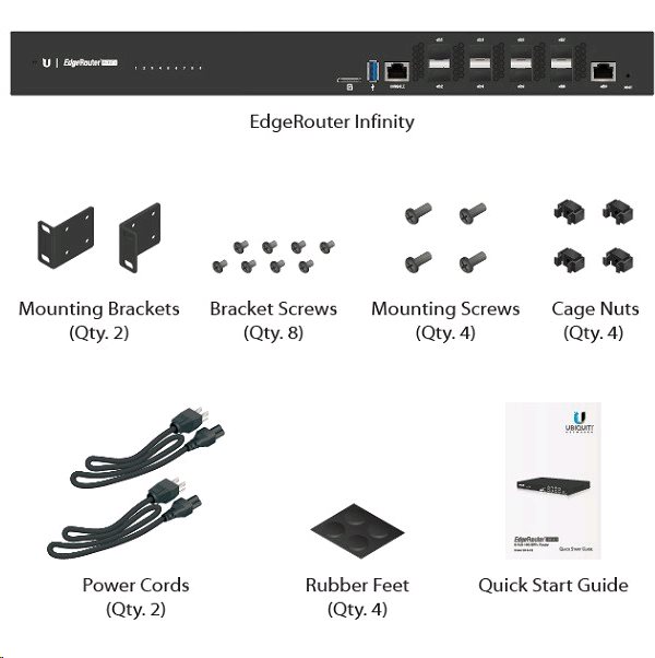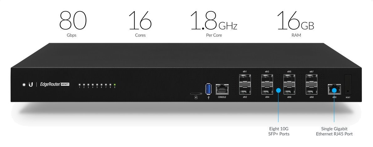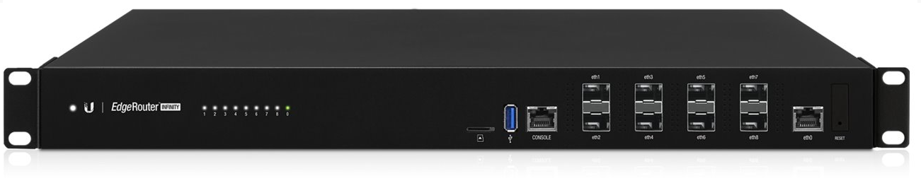 UBNT EdgeRouter Infinity se řadí svým výkonem a rozhraními do core řešení pro poskytovatele internetu, podnikových sítí a obsahuje celkově 8x SFP+ port pro připojení 10 Gbps linek a jeden Gigabit Ethernet.Další informace