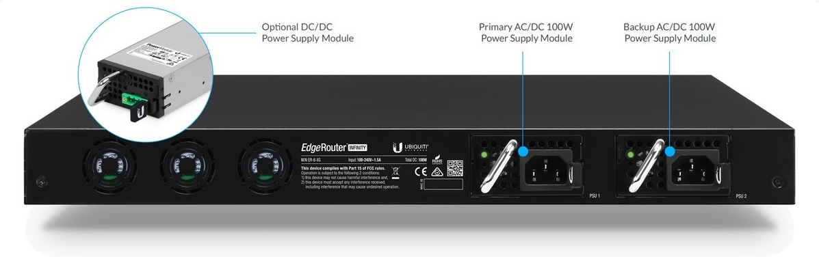 EdgeRouter Infinity obsahuje již při koupi dva napájecí hot-swap moduly AC/DC, z nichž jeden je určen pro zálohování. K routeru místo stávajícího AC/DC zdroje lze dokoupit i napájecí modul (měnič) typu DC/DC, který vyžaduje na vstupu 38 až 54 VDC.