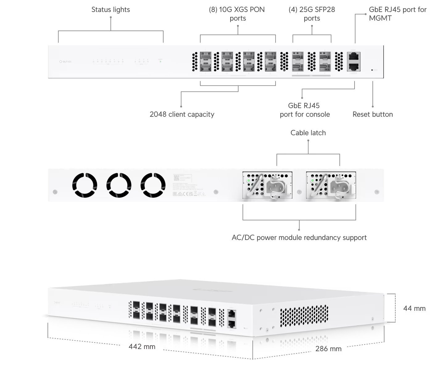UBNT Fiber OLT XGS nabízí 8x 10Gb/s XGS/XG-PON port a podporuje až 256 klientů na port, celkově tedy až 2048 klientů. Pro připojení konektivity jsou připraveny 4x SFP28 porty s rychlostí až 25Gb/s.Další informace