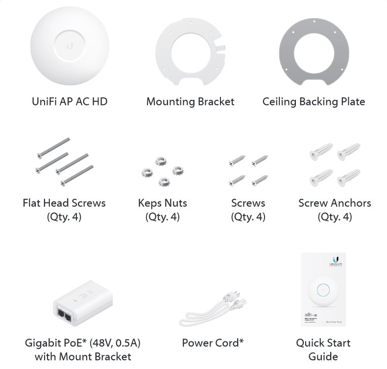 Balení obsahuje veškerý potřebný materiál pro montáž jednotky na stěnu nebo strop. UniFi AC HD je kompatibilní s držákem pro UniFi AC PRO.