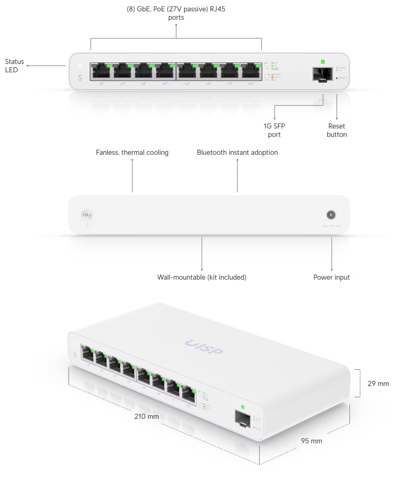 UBNT UISP Switch je L2 PoE switch bez ventilátorů s 8x Gigabit LAN a 1x SFP portem. Celkový PoE budget je 110 W a maximálně 30 W / port.Další informace