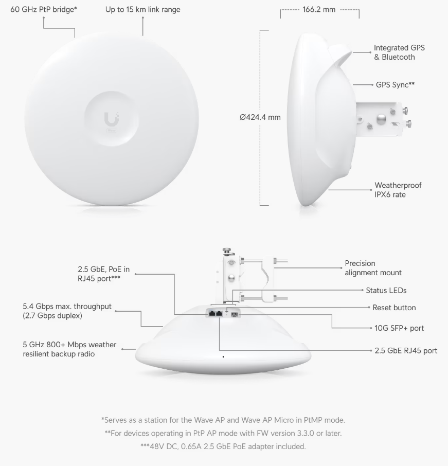 UBNT Wave Pro je 60GHz klientská jednotka s anténním ziskem 46 dBi určená pro PtP (Point-to-Point) i PtMP (Point-to-Multipoint) spoje s rychlostí až 5,4 Gb/s. Jednotka je vybavena 5GHz zálohou s rychlostí 800+ Mb/s pro zachování konektivity i v nepříznivém počasí. Jednotka má 2x LAN porty s rychlostí 2,5 Gb/s a jeden SFP+ port s rychlostí až 10 Gb/s. Šířka kanálu může být 1080 i 2160 MHz. Pro co nejlepší dostupnost je přítomno 5GHz rádio (802.11ax WiFi 6) jako záloha. Jednotka je také vybavena integrovanou GPS anténou.