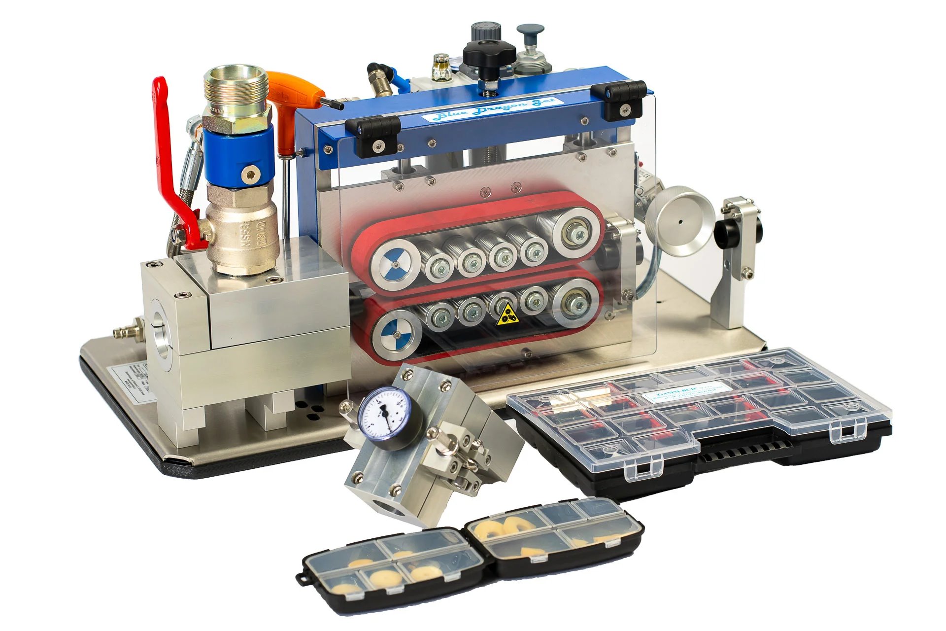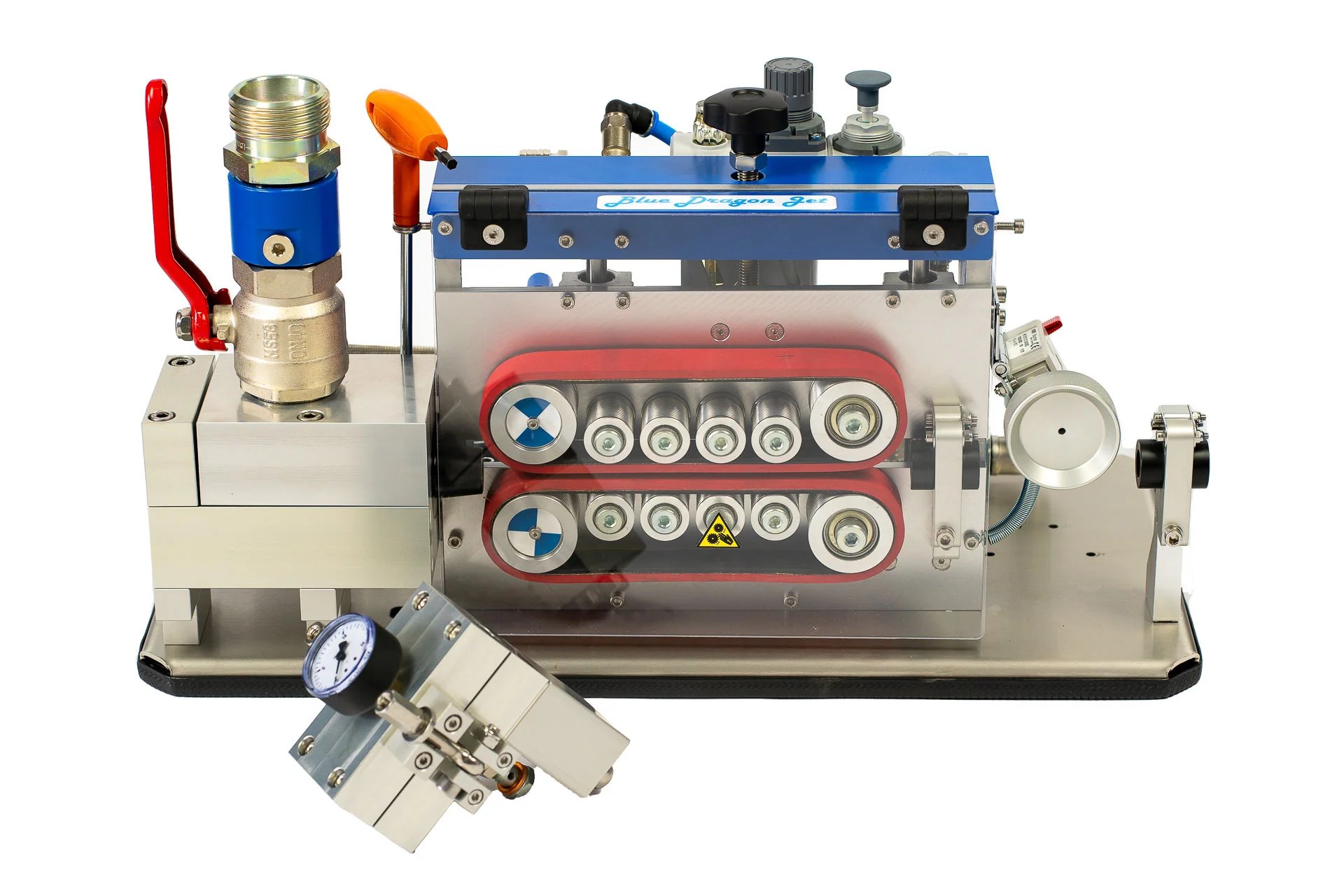Zafukovačka Blue Dragon Jet MAX DUAL HEAD je všestranné pásové zařízení s pneumatickým pohonem určené k zafukování kabelů a mikrotrubiček do HDPE trubek i kabelů do mikrotrubiček. Díky své jednoduché a robustní konstrukci je velmi snadno ovladatelná při zachování dlouhé životnosti. Stroj je s dodávaným příslušenstvím zafukovat kabely/trubičky o průměrech 6 - 15 mm do HDPE trubek 32, 40 a 50 mm a optické kabely 4 - 10 mm do mikrotrubiček 5 - 16 mm. Konstrukce je uzpůsobena pro možnost vyjmutí neukončeného kabelu. Zafukovačka je vybavena praktickým mechanickým počítadlem, které umožní odečítat délku zafukovaného kabelu.